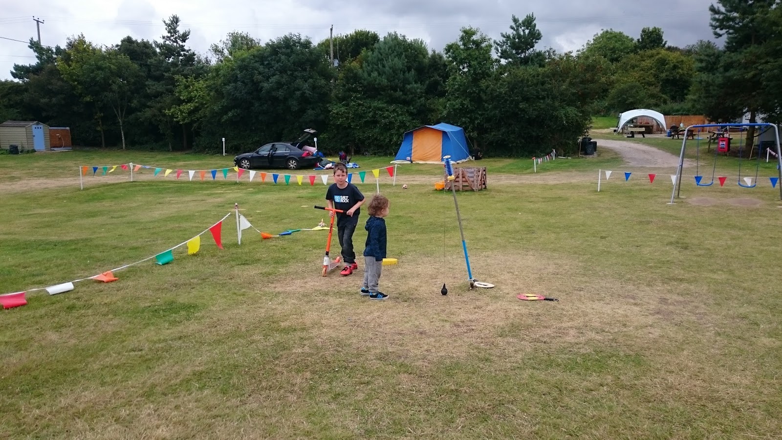 The trip itself went as all things do when we do them, we just winged it. I ran around chasing Noah as he fled like he were a caged animal grabbing his chance for freedom, while Andrew struggling trying to erect a tent all by himself. In the larger side of the site where our pitch was, they have kept the whole central area free of pitches and put some toys and play equipment and popped some bunting around to corden the area off. This served well at keeping the kids occupied and in sight.
